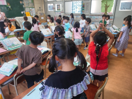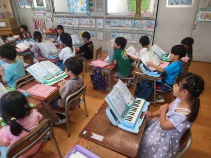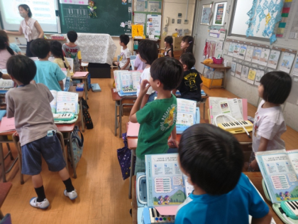 音楽科の時間は、鍵盤ハーモニカの練習をしたり、「やまびこ ごっこ」の曲を、2つのグループに分かれて山びこごっこをしながら歌ったりしました。