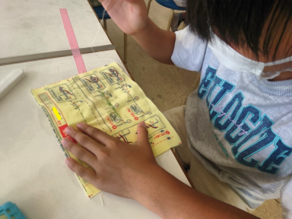 前に練習した玉結びをして、半返しぬいで布を縫っていきます。