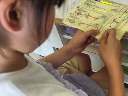 今日は、練習布を使って、半返しぬいの練習をしています。