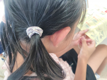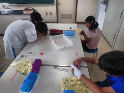 今日は、練習布を使って、半返しぬいの練習をしています。