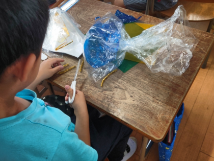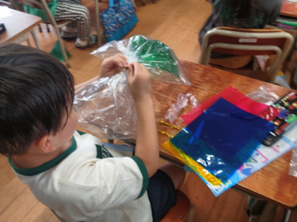 図工科の時間は、透明の袋や色シート、カラーモールなどを使って形を作っていきます。