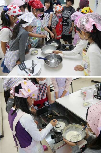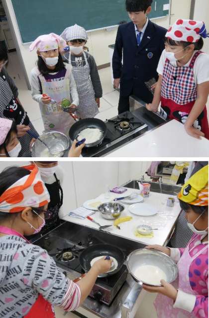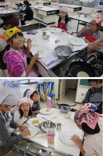 家庭科クラブではクレープを作りました。生地からつくって焼いてトッピングします。おもいおもいのトッピングでおいしいクレープができました。