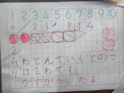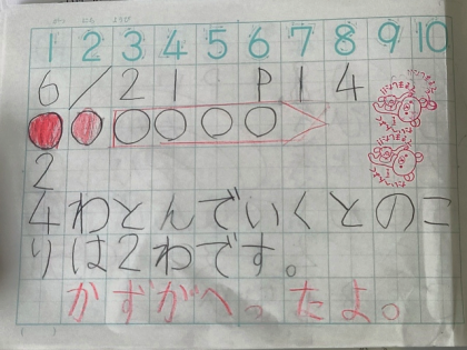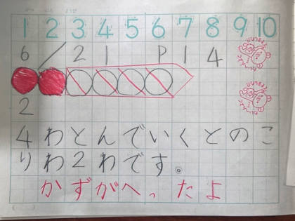 「とりが 4わ とんでいくと、のこりは 2わです。」