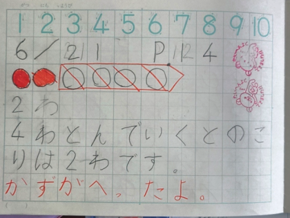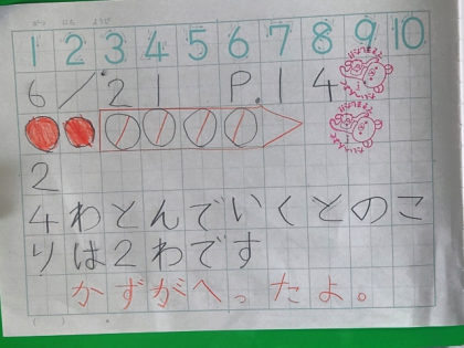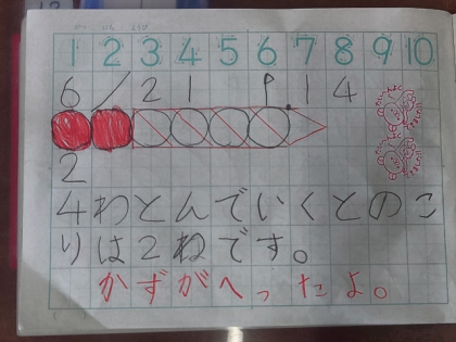 「とりが 4わ とんでいくと、のこりは 2わです。」