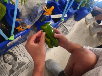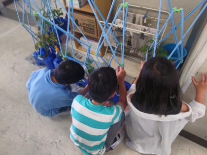 生活科の学習が終わって、子どもたちはさっそく自分が育てている野菜と、お店で売っている野菜とを大きさ、色、形などを比べていました。