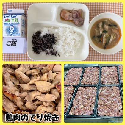 今日の献立は、鶏肉のり焼き・みそ汁・魚ひじきそぼろ・ごはん・牛乳でした。