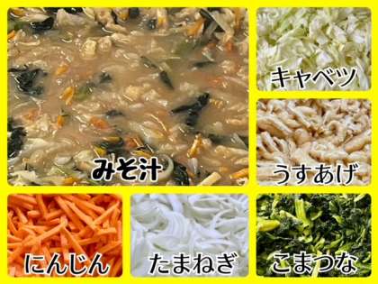 「みそ汁」はにぼしでだしをとり、うすあげ、キャベツ、たまねぎ、こまつな(冷)、にんじんを使用しています。