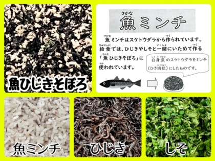 「魚ひじきそぼろ」は、魚ミンチとひじきをいため、砂糖、みりん、うすくちしょうゆで味つけし、最後にしそを加えて風味を増しています。ご飯によく合う一品です。