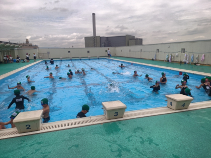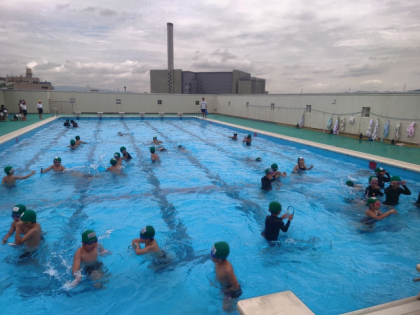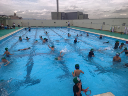 今日のプール学習は、水慣れのあと、プールの横方向をぞうさんになったり、ぞうさんになったり、カニさんになったり、イルカさんになったりしながら歩きました。