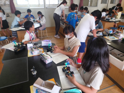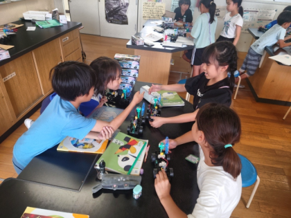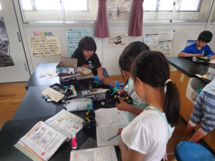 理科の時間は、モーターをもっと速く回すには、どんなつなぎ方をすればよいのか考え、実験しました。