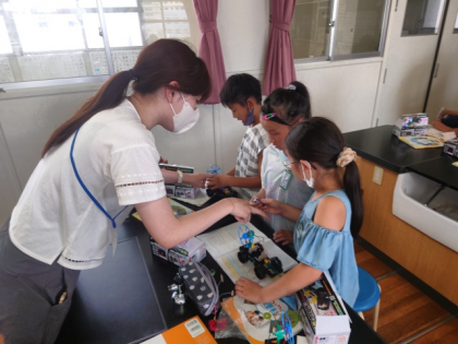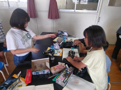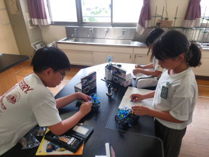 理科の時間は、モーターをもっと速く回すには、どんなつなぎ方をすればよいのか考え、実験しました。