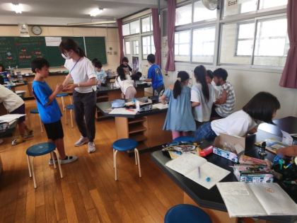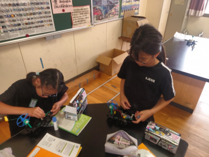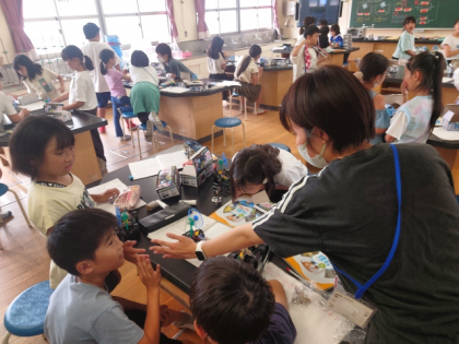 理科の時間は、モーターをもっと速く回すには、どんなつなぎ方をすればよいのか考え、実験しました。