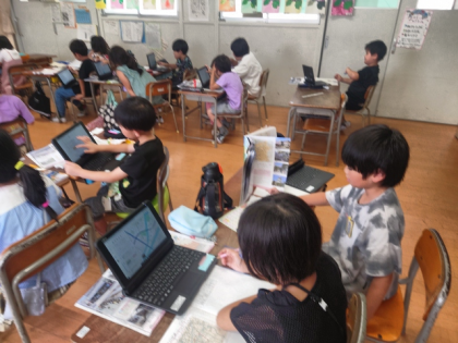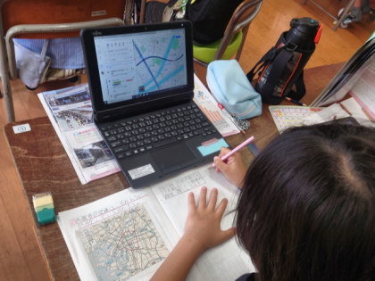 社会科の時間は、地図を見ながら、大阪市の交通の広がりについて学習しました。