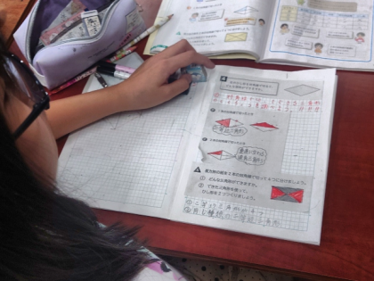 算数科の時間は、ひし形を1本の対角線で切ったり、長方形を2本の対角線で切ったりすると、どんな三角形ができるか調べました。