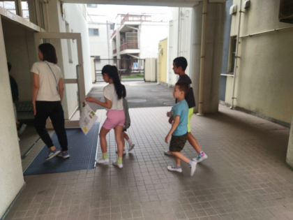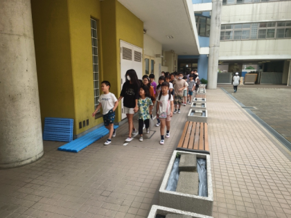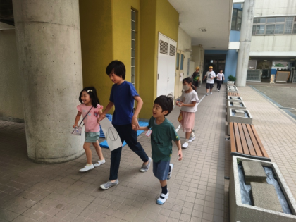6年生が同じ班の1年生をつれて、講堂に向かっています。