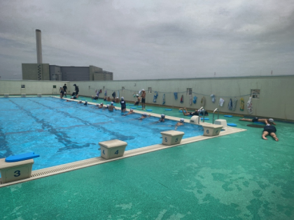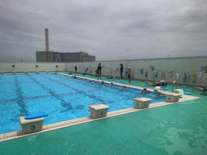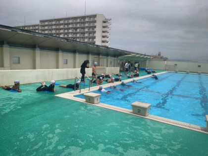 プールサイドで練習した後、水中で足の動きを確認し、最後にビート板を持ってプールの縦方向に泳ぎました。