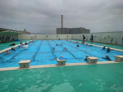 プールサイドで練習した後、水中で足の動きを確認し、最後にビート板を持ってプールの縦方向に泳ぎました。