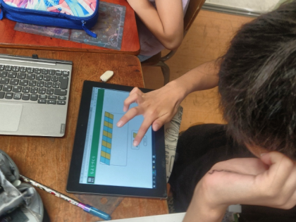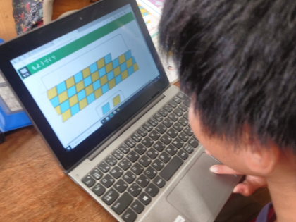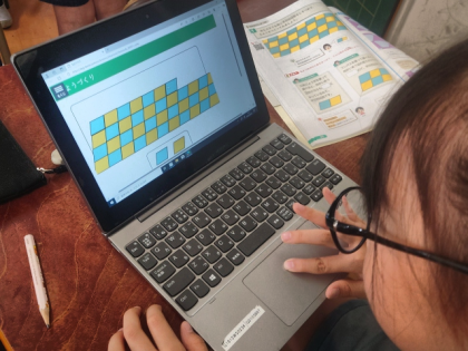 算数科の時間は、学習用端末を使って、形も大きさも同じ平行四辺形をしきつめ、もようをつくっています。