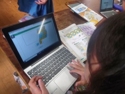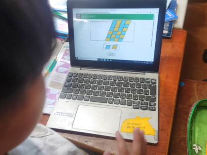 算数科の時間は、学習用端末を使って、形も大きさも同じ平行四辺形をしきつめ、もようをつくっています。