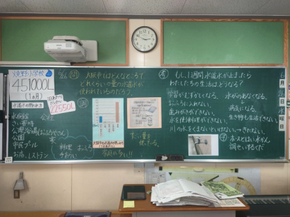 社会科の時間は、大阪市では、どんなところで、どれぐらいの水道水が使われているのか調べました。