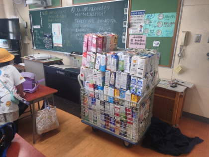 資料から大阪市民一人あたりの1日に使う水の量は394Lということがわかりましたが、実際に394本の牛乳パックが出てくると、その量に子どもたちは「こんなに使っているのか!」ととても驚いていました。