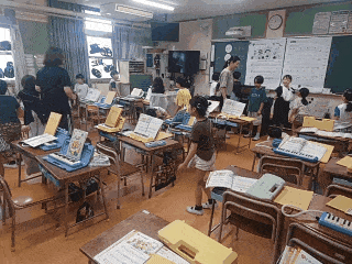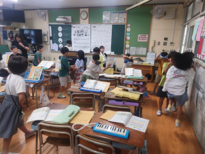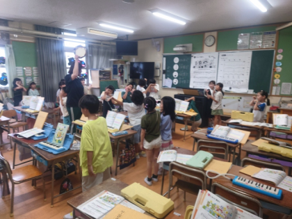 音楽科の時間は、「ぴょんぴょこロックンロール」をカエルや子ねこになりきって体を動かしながら楽しく歌ったり、「山びこごっこ」を鍵盤ハーモニカで演奏する練習をしたりしました。