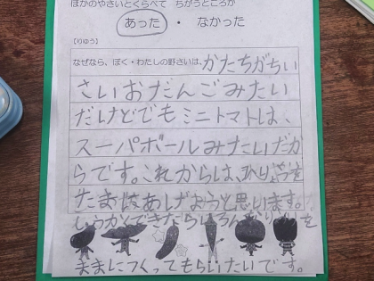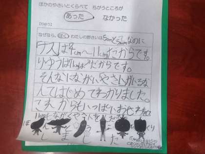 今日は、自分の野菜と他の野菜の「大きさ」「色」「かたち」を比べて話し合い、気付いたことをカードに書きました。