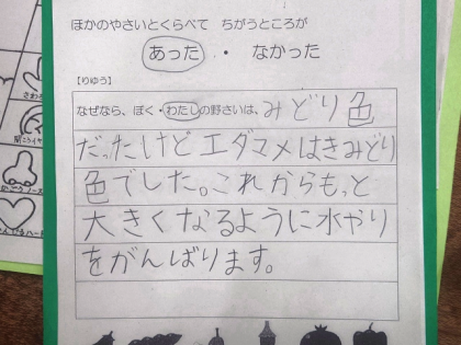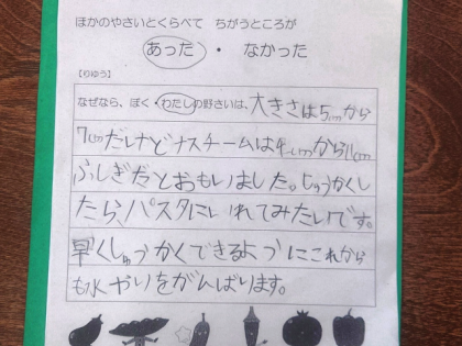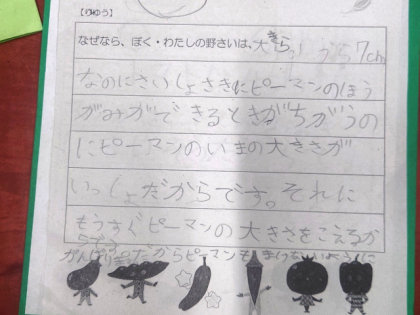 今日は、自分の野菜と他の野菜の「大きさ」「色」「かたち」を比べて話し合い、気付いたことをカードに書きました。