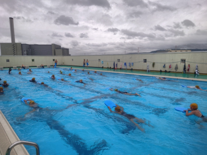 ビート板を持って、足の動かし方に気をつけながら、プールを横方向に泳いだ後、縦方向にも泳いで練習しました。
