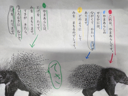 今日は、やまあらしがどうやってみをまもるのか、本文から読み取って考えました。