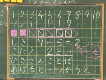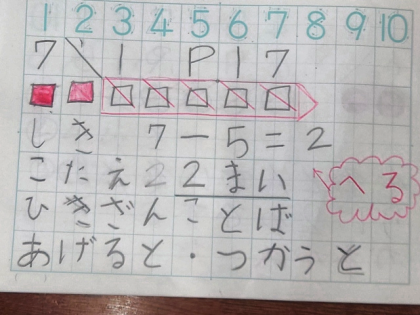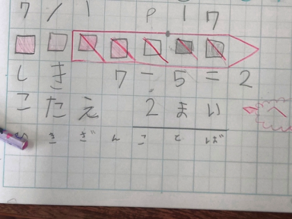 今日の問題は、「7枚の色紙から5枚使うと何枚残りますか。」