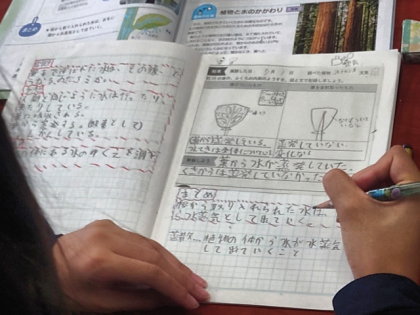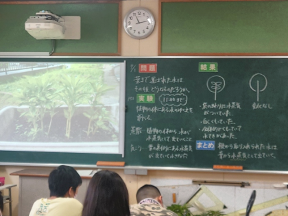 理科の時間は、根から取り入れられ、葉まで運ばれた水が、その後どうなるのか実験で調べました。