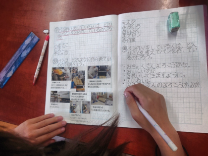 社会科の時間は、パンができるまでにはどのような仕事があるのか調べ、パン作りをしている人たちの思いや願いについて考えました。