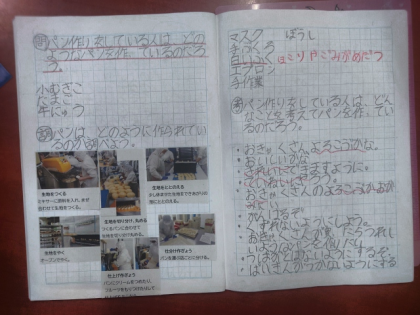 社会科の時間は、パンができるまでにはどのような仕事があるのか調べ、パン作りをしている人たちの思いや願いについて考えました。