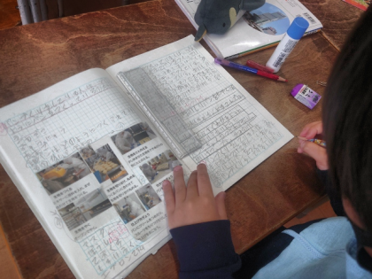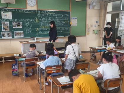 社会科の時間は、パンができるまでにはどのような仕事があるのか調べ、パン作りをしている人たちの思いや願いについて考えました。