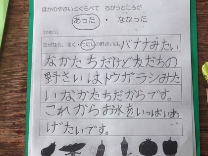 自分の野菜と他の野菜を比べて、形や色、大きさなど、ちがうところがあるかどうか、また、どんなところがちがうのか、ワークシートにまとめて発表しました。