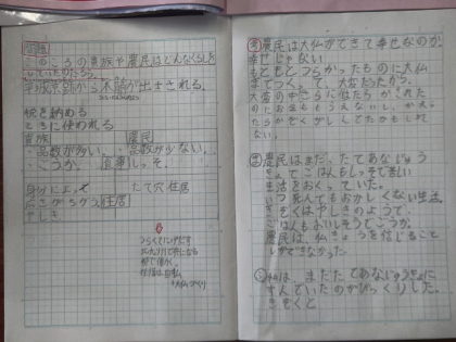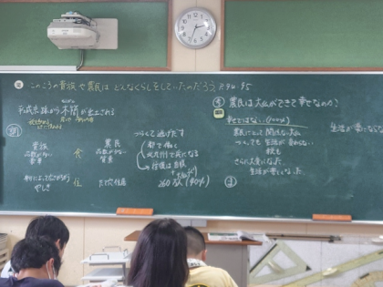 社会科の時間は、奈良時代の貴族と農民のくらしについて調べた後、その違いについて話し合いました。