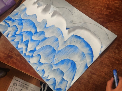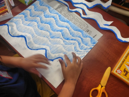 画用紙を半分に折って、鉛筆で波線を7本書いて、波の線にそってはさみで切って、パスで色を塗っていきます。