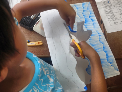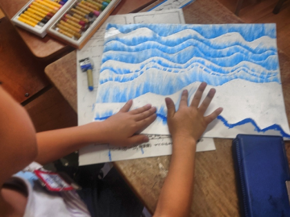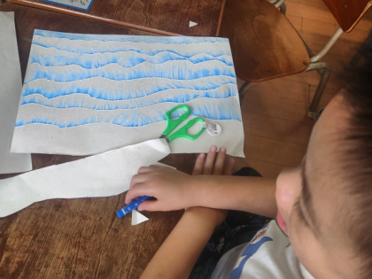 画用紙を半分に折って、鉛筆で波線を7本書いて、波の線にそってはさみで切って、パスで色を塗っていきます。