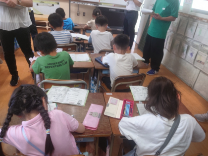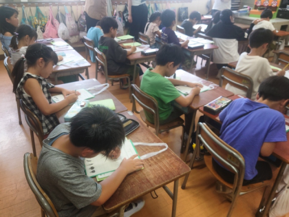 まず、自分の野菜とお店で買った野菜を比べ、実の大きさや形、色など、同じところや違うところを見つけてワークシートに書き、グループで伝え合いました。