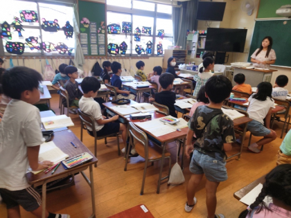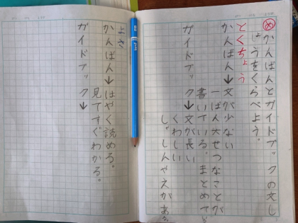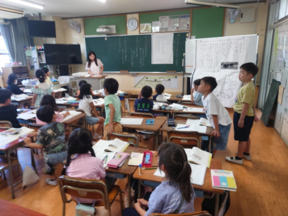 国語科の時間は、動物園のアフリカゾウを紹介する「看板」と「ガイドブック」について、それぞれの文章の特徴をくらべて話し合いました。