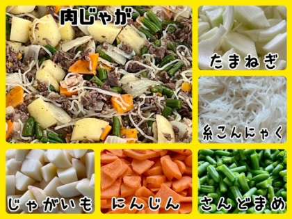 「肉じゃが」は、牛肉を主材に、じゃがいも、糸こんにゃく、たまねぎ、にんじん、青みにさんどまめを使用した児童人気の献立です。
