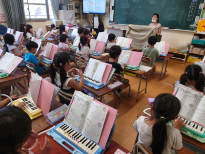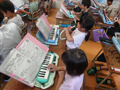 音楽科の時間は、鍵盤ハーモニカで、「ド」「レ」「ミ」の3つの音を使って「あそびましょう」の練習をしました。