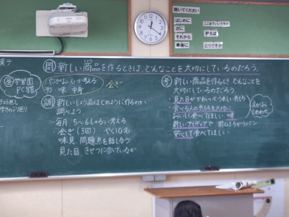 社会科の時間は、パン工場では新しい商品をどのように作っているのかを調べ、パン工場で働いている人たちがどんなことを大切にしているのか考えました。
