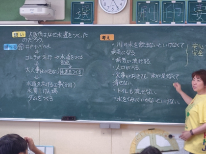 社会科の時間は、大阪市の水道事業の歴史について調べ、なぜ水道をつくったのか考えました。