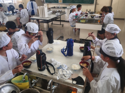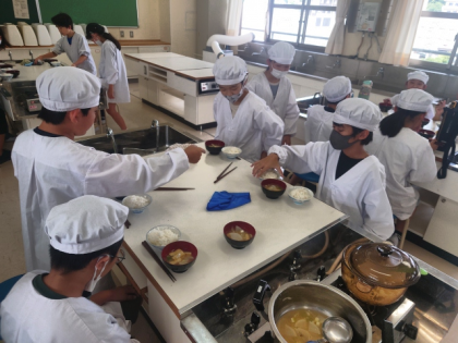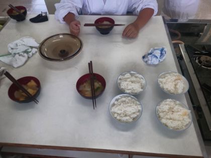 家庭科の時間は、ごはんとみそ汁の調理実習をしました。