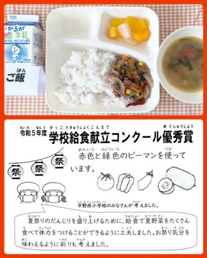 令和5年度学校給食献立コンクール優秀賞に選ばれた献立です。児童が考えたねらいは、「夏祭りのだんじりを盛り上げるために、給食で夏野菜をたくさん食べて体力をつけることができるように工夫しました。お祭り気分が味わえるように彩りも考えました。」です。