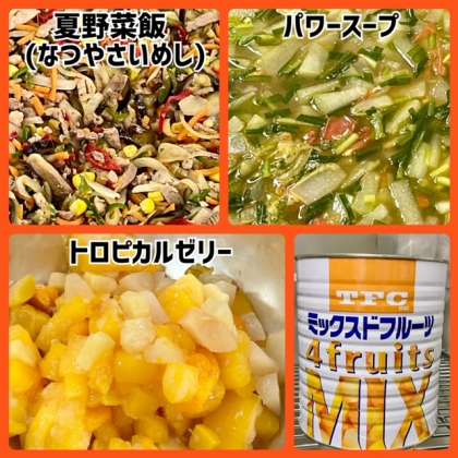今日の献立は、夏野菜飯(なつやさいめし)・パワースープ・トロピカルゼリー・牛乳でした。
