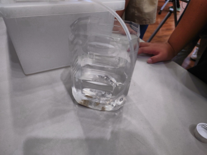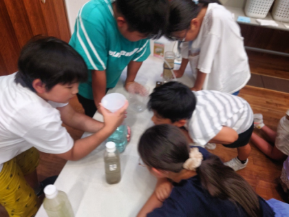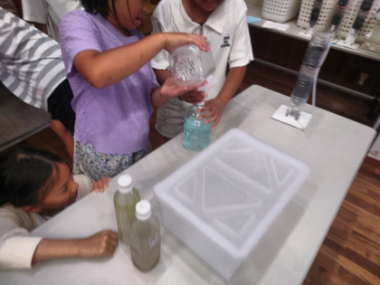 最後に、淀川の水をどのようにしてきれいにしているのか、砂でろ過したり、活性炭を用いて不純物やにおいを取り除いたりするなど、実験で確かめました。