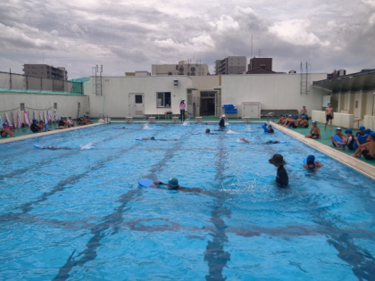 最後に、プールの縦方向で、足をつかずにどれぐらい泳げるかを確認しました。